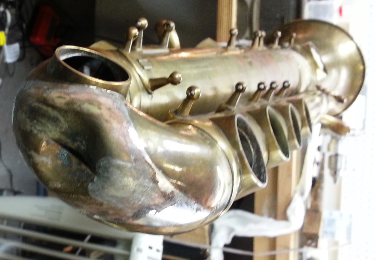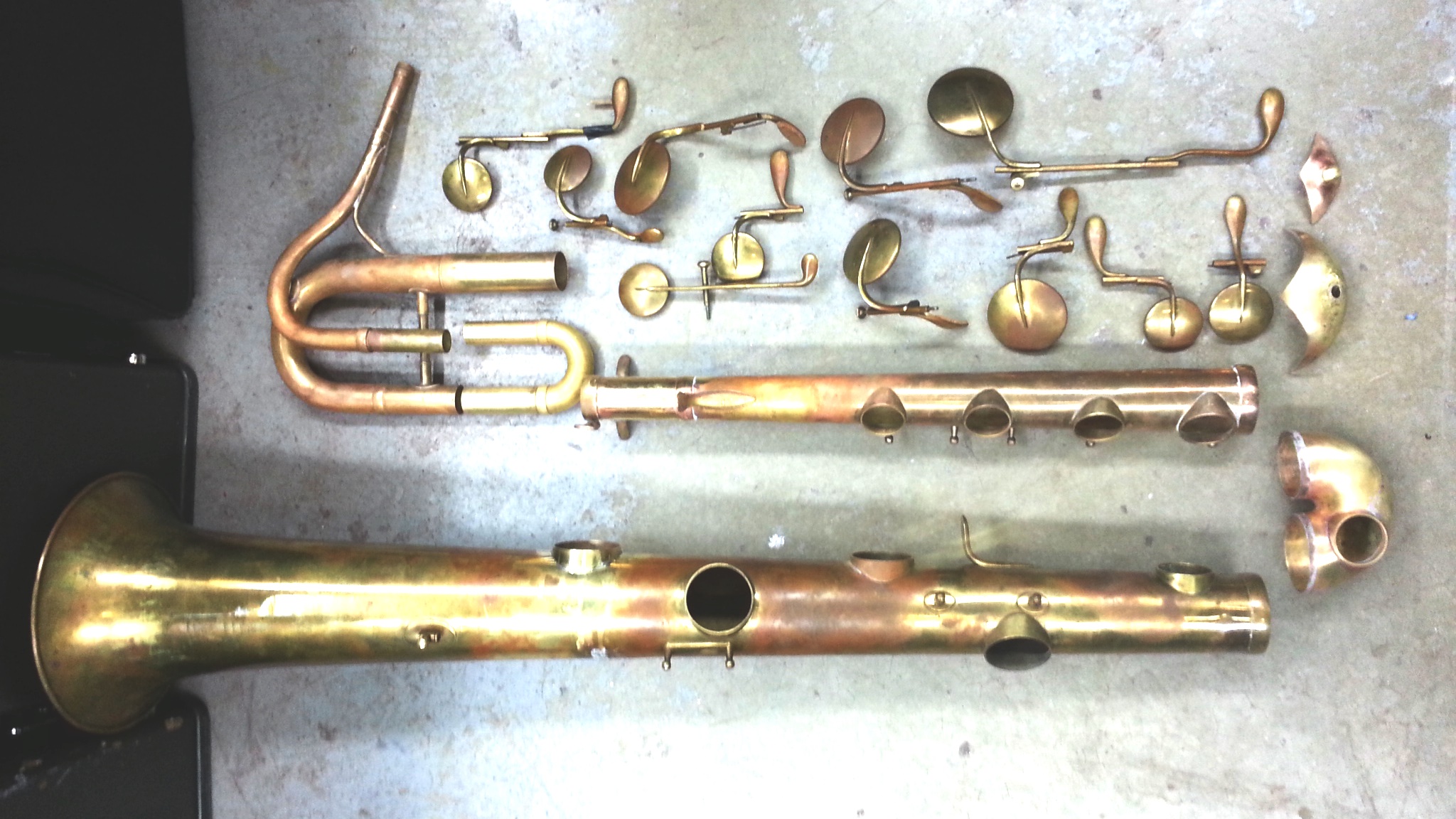 So Barry Boccaner, a software engineer and musical polyglot, comes into my shop with this 1902 Couesnon ophicleide that has seen better days. It had broken solder joints, the keys were bent, and it had a huge split in the bottom bow. It needed to be entirely re-built.