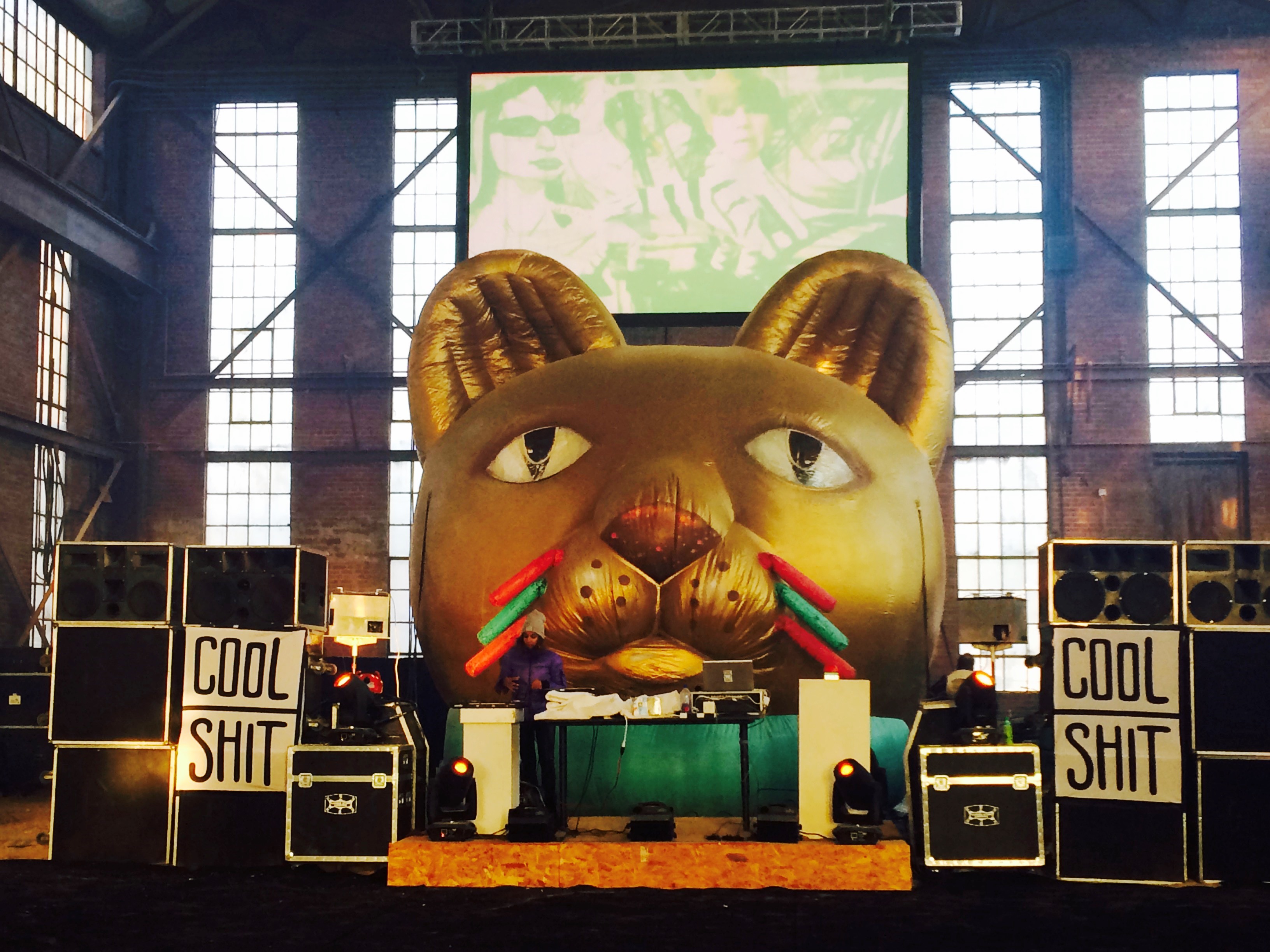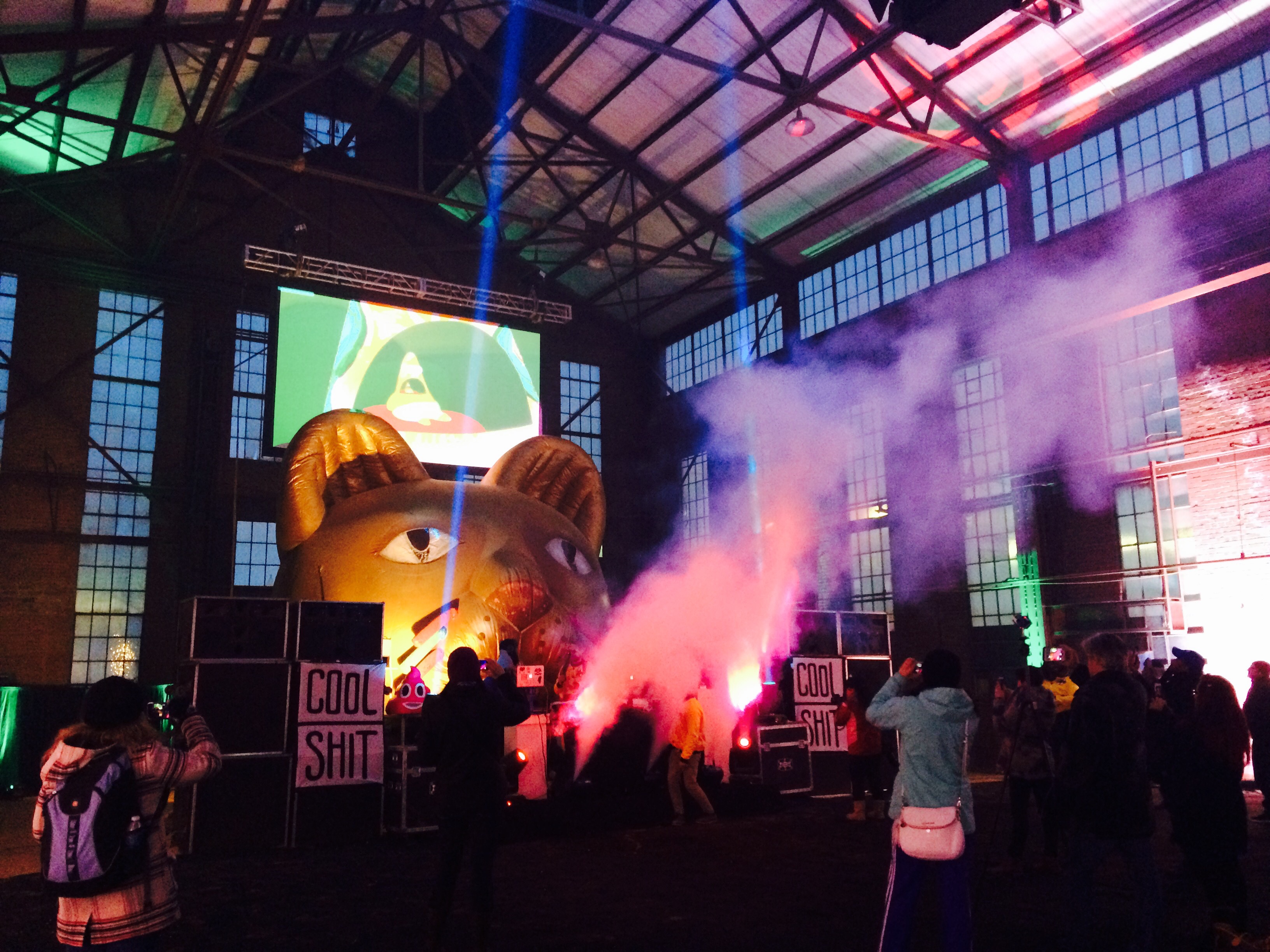Back inside the frozen warehouse (record cold that night) the show began with a puff of smoke, a blast of music out of the very loud speakers, followed by colorful lasers shooting out of its big cat eyes.