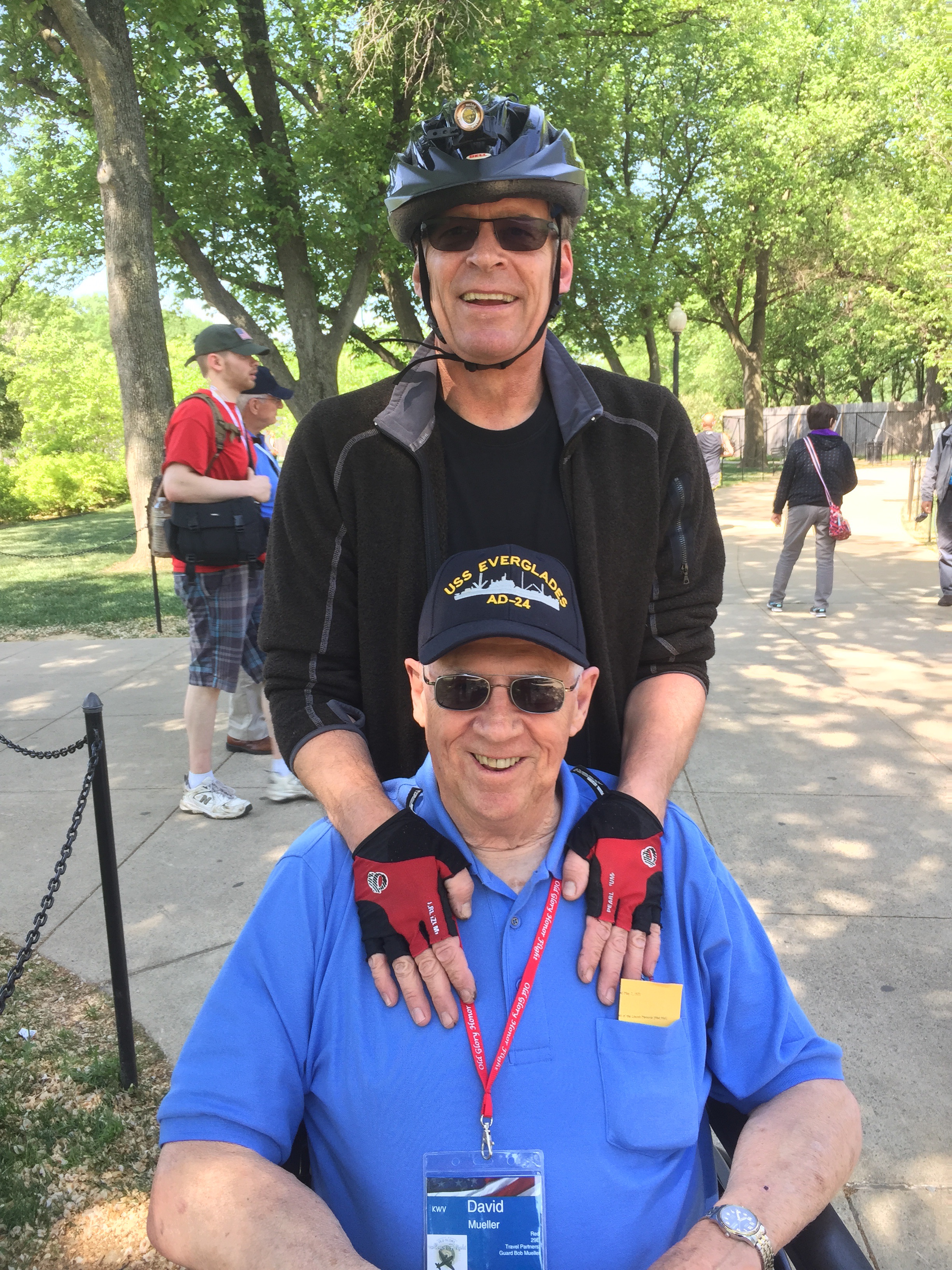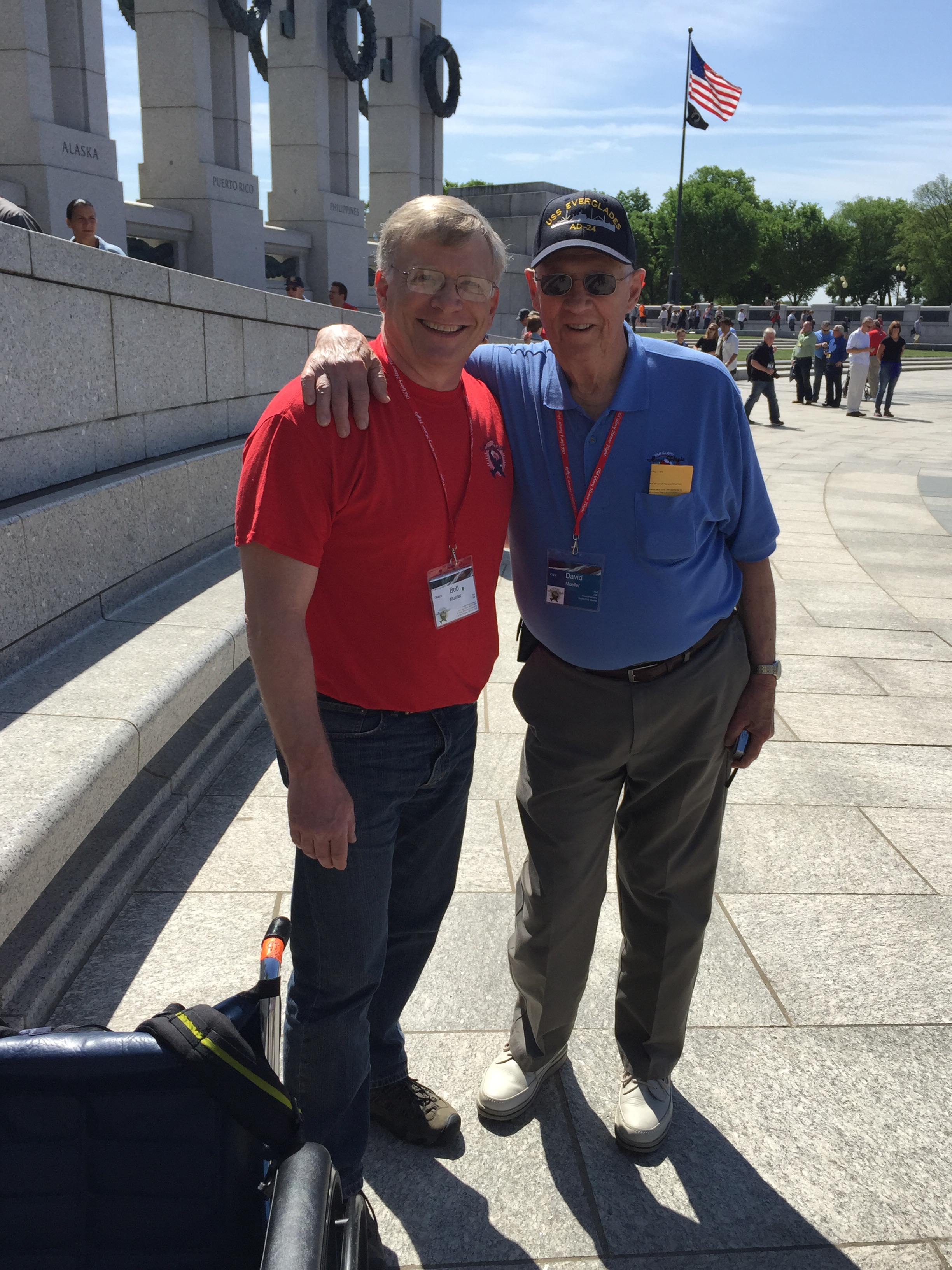 Last Thursday my dad, Dave, came to town. He arrived with my older brother, Bob, on an “Honor Flight” from Wisconsin with a plane load of veterans from WWII, the Korean and Vietnam wars. Honor Flights are arranged by the Honor Flight Network, a non-profit formed to recognize veterans for their service to the nation. They do this with a full day program of visits to memorials around the city, and return them home the same day to a crowd of fans.