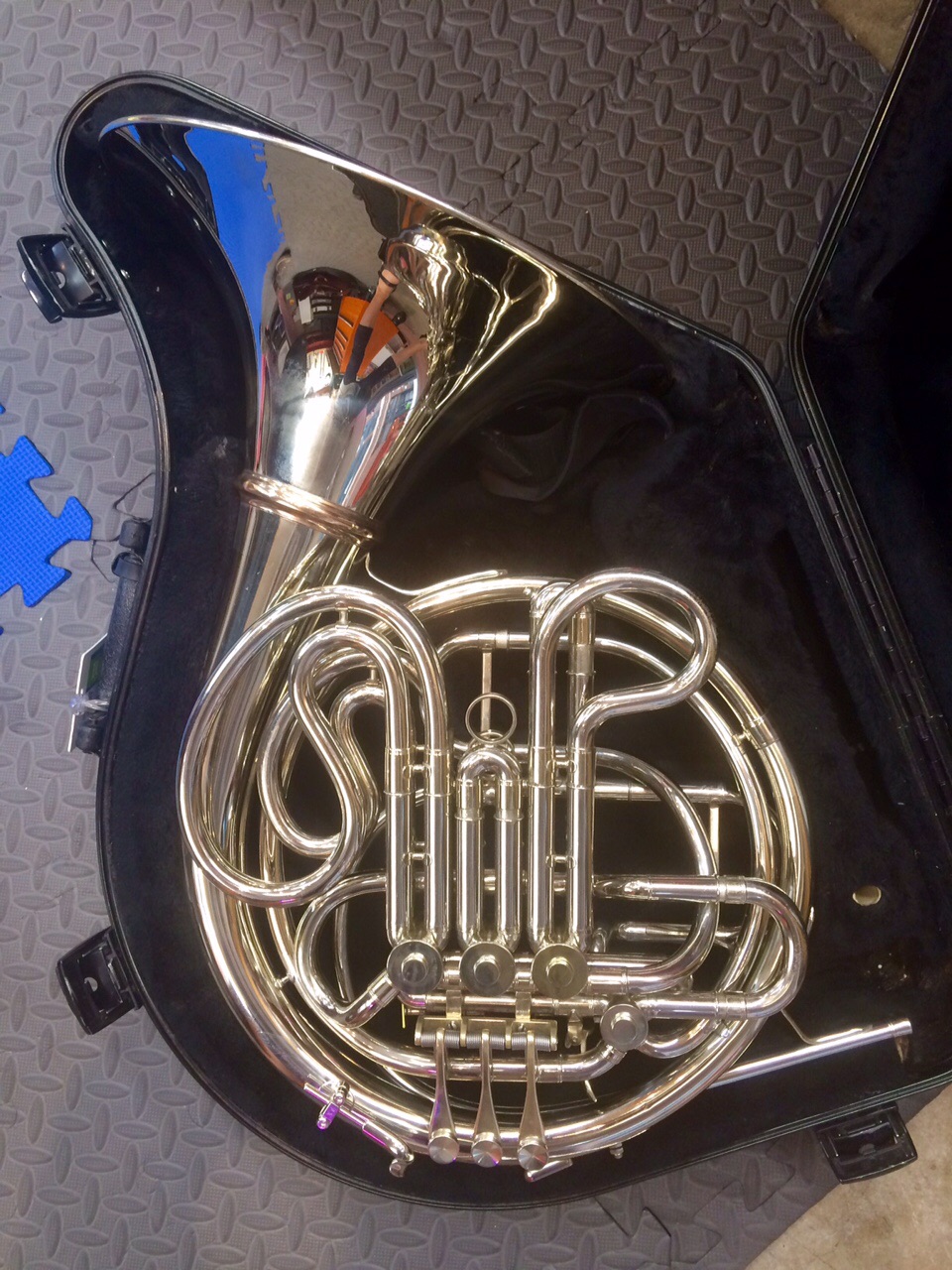 Why would you do that, you ask? French Horns are odd shaped instruments that come in cases molded to their oddity. If you need to fly anywhere, it doesn’t fit into the overhead compartment and you wouldn’t dare put it in with your luggage. So you cut it in half and store it in a case made for that purpose.