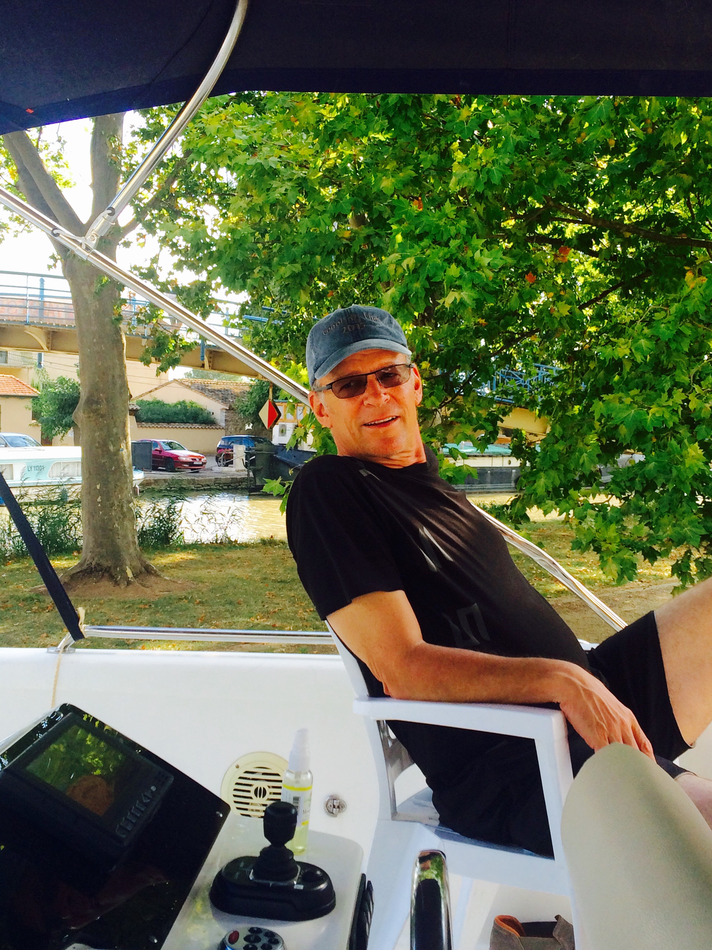 After a couple nights at dock, we launched and headed toward Trebes for a nice lunch and a stop at a rockin’ wine store to stock up. The canal section just past Trebes was one of the most beautiful parts of the canal. Here is Captain Matt, our fearless leader.