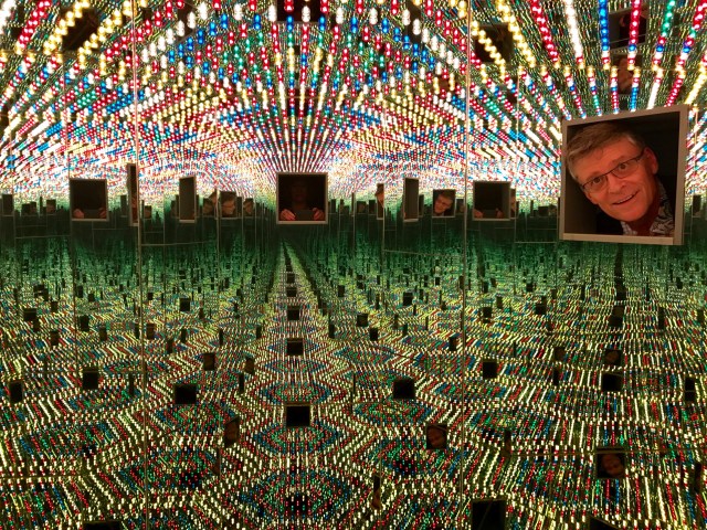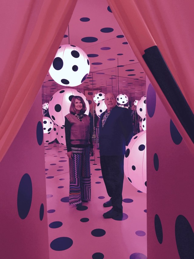 On Saturday night we celebrated the birthday of our good friend Marianne by attending a Gala at the Hirshhorn Museum. It featured an amazing exhibit, called “Infinity Mirrors” by Yayoi Kusama, which is up and about to move on. These photos don’t do it justice, but just imagine yourself at the edge of infinity…