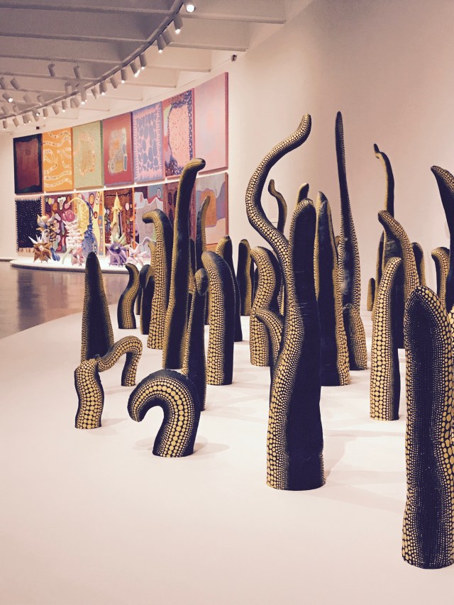 There were a number of sculptural works outside of the infinity rooms made of stuffed cotton forms that look like creatures from another planet. This is a room full of creatures.