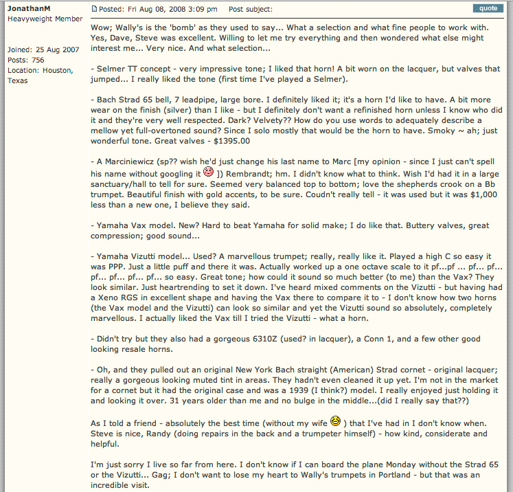 Randy is the only repairman that touches my horns. He’s a magician when it comes to slide repair. He did a fantastic job on the conversion of my vintage ’67 Conn 88H. I’ve played Conn’s factory open-wrap design and I prefer Randy’s design. No more “stuffy” trigger notes!