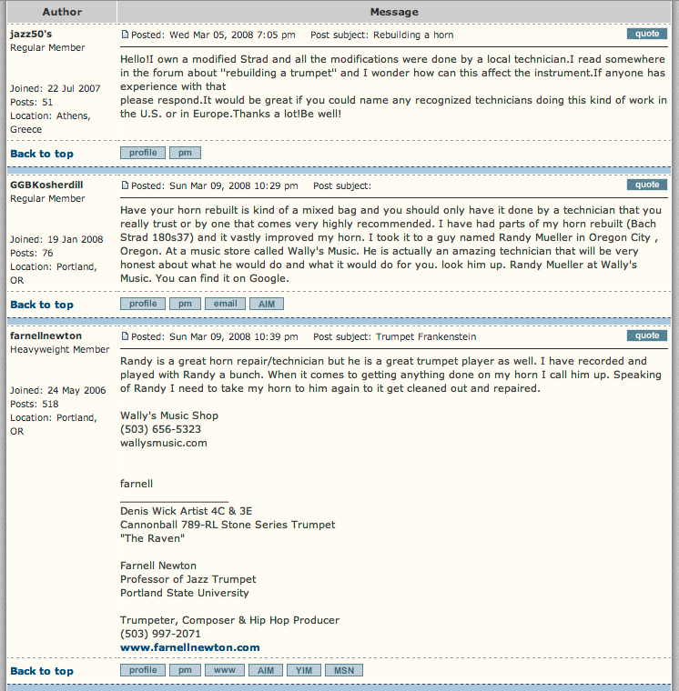 Personally, I have played with Randy hundreds of times and have never let anyone else touch my horns. He has done everything under the sun for me from building me a C trumpet to tweaking my horn on the bandstand. I’ve seen him take trashed horns and turn them into great playing instruments and take great horns and turn them into gems. His attention to detail is unmatched. He always makes time to find out what you are looking for in your instrument and finds a way to make it happen.
